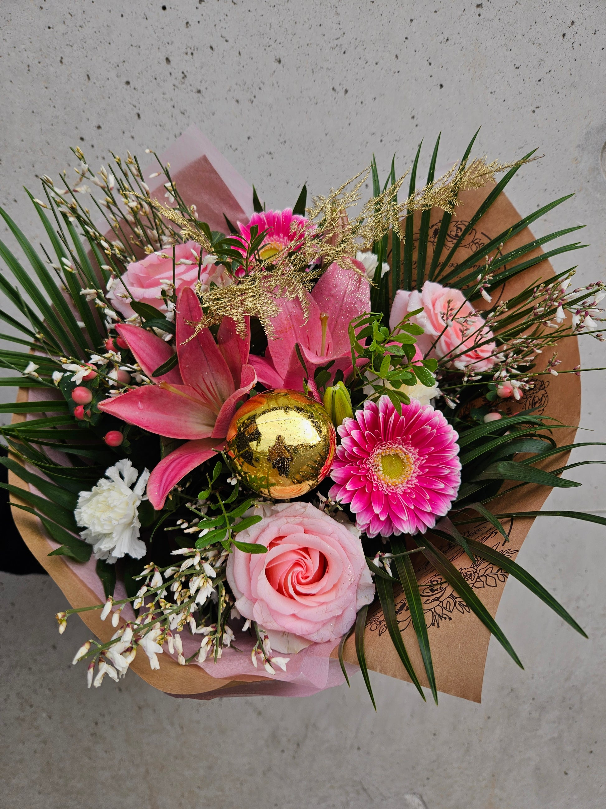 Bouquet dans les camaïeu de rose et doré composé de lys, rose, germini, eucalyptus et d'autres fleurs ( taille S ).