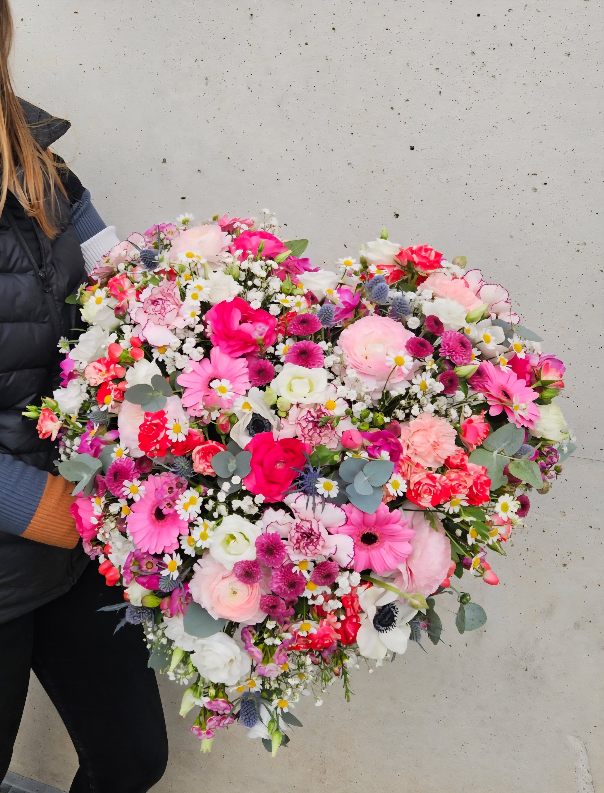 Coussin en forme de cœur de fleurs piquée dans de la mousse, dans un camaïeu de rose et blanc. La photo correspond à la taille XL. Les fleurs peuvent changer en fonction des saisons et de la disponibilité.