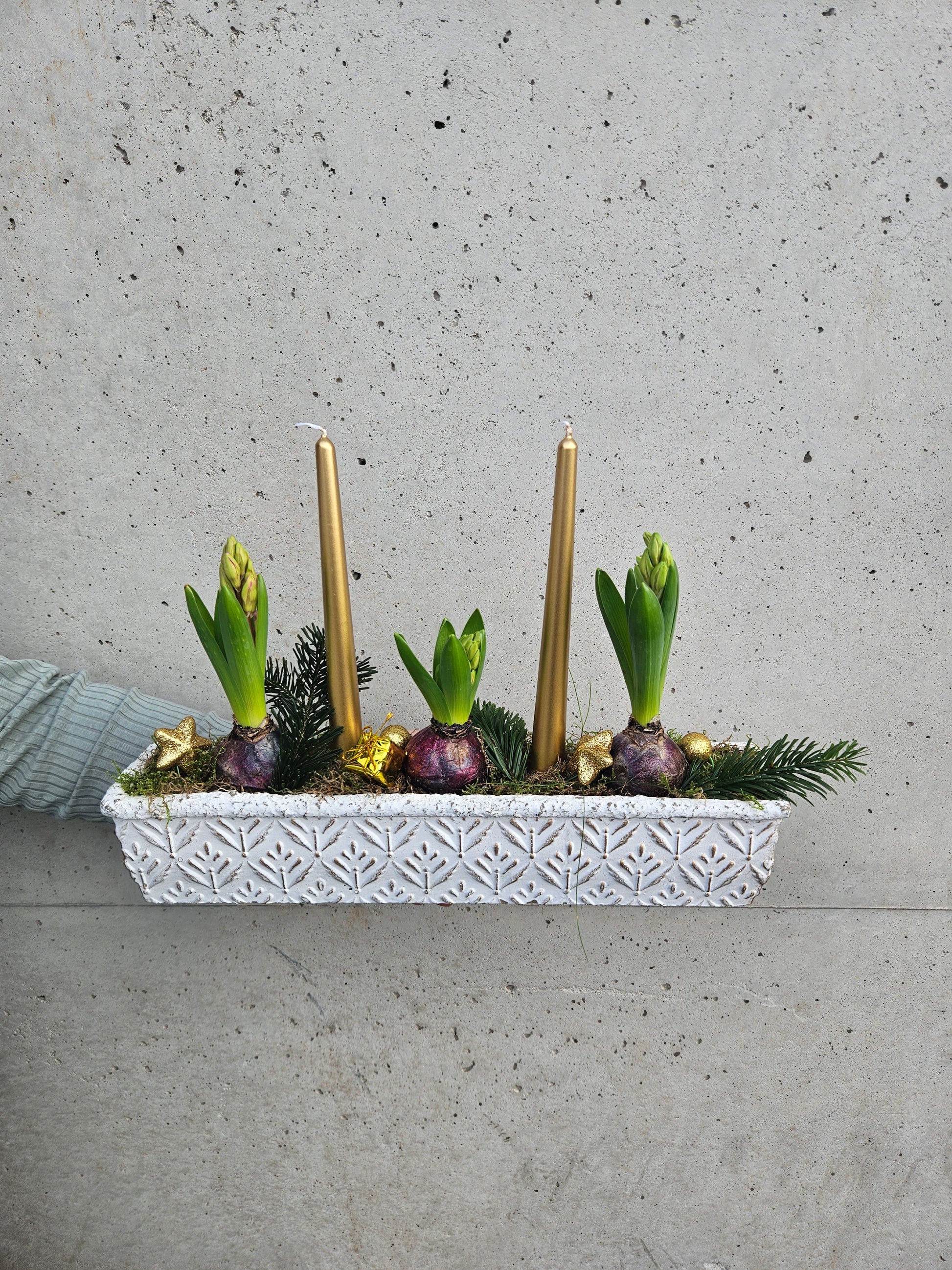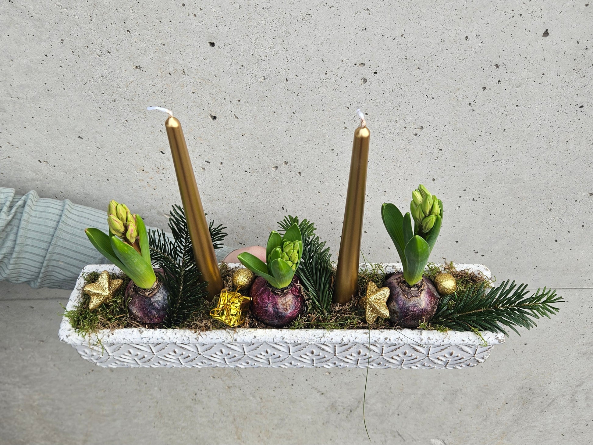 Centre de table avec des jacinthes racinée dans les tons blanc et doré avec des bougies doré. La couleur peut change en fonction de la disponibilité.