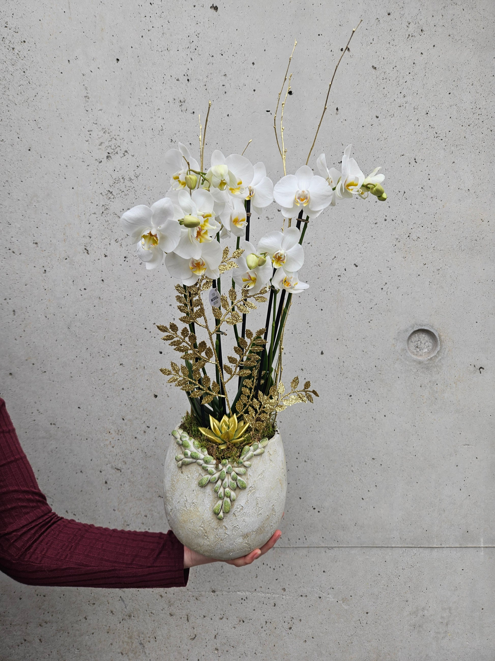 Composition de plante d'intérieur dans les tons de blanc et doré avec une orchidée 5 tiges et une echeveria doré .