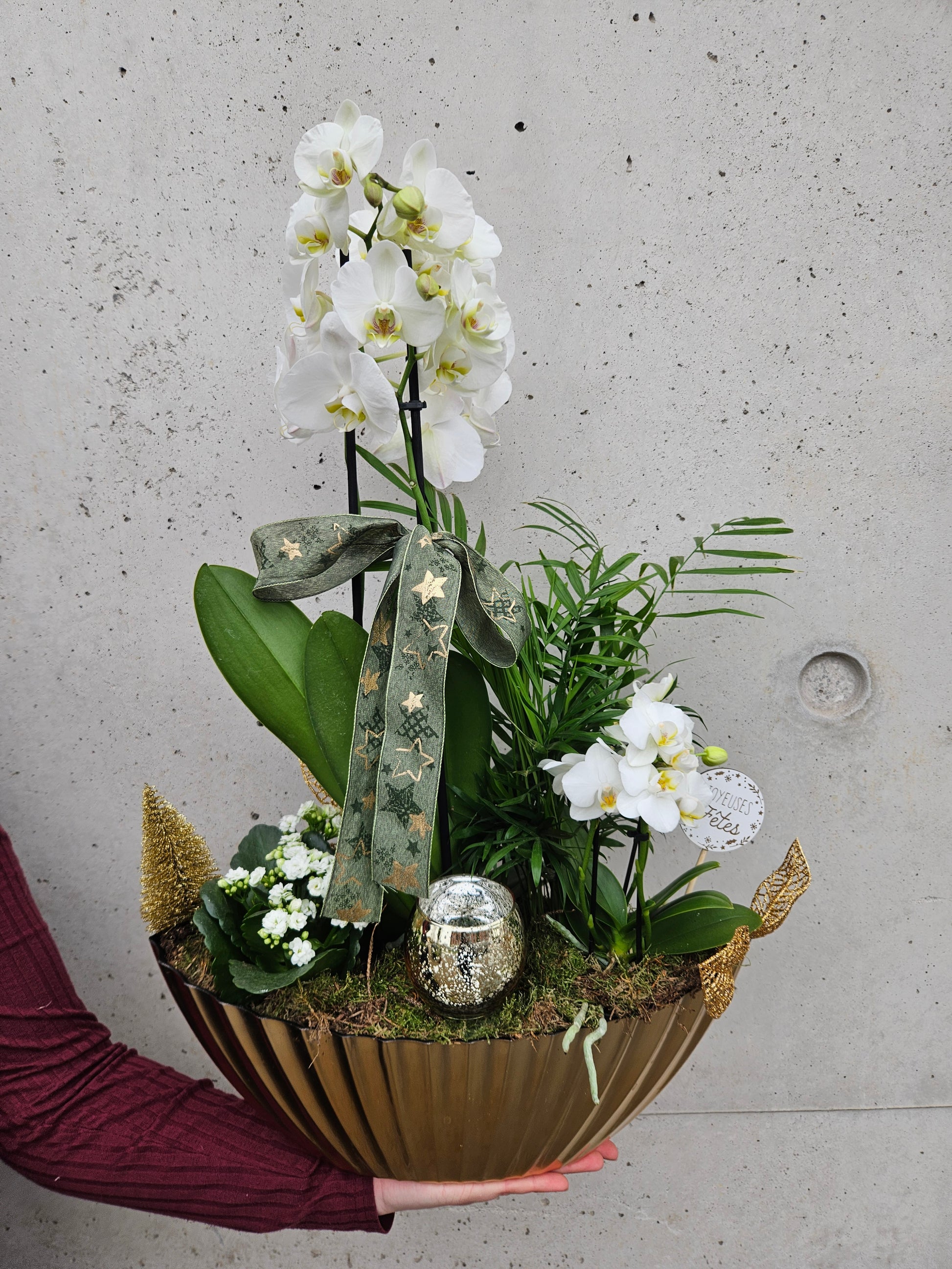 Composition de plante d'intérieur dans les tons de blanc et doré avec 2 orchidées 2 tiges et d'autres plantes .