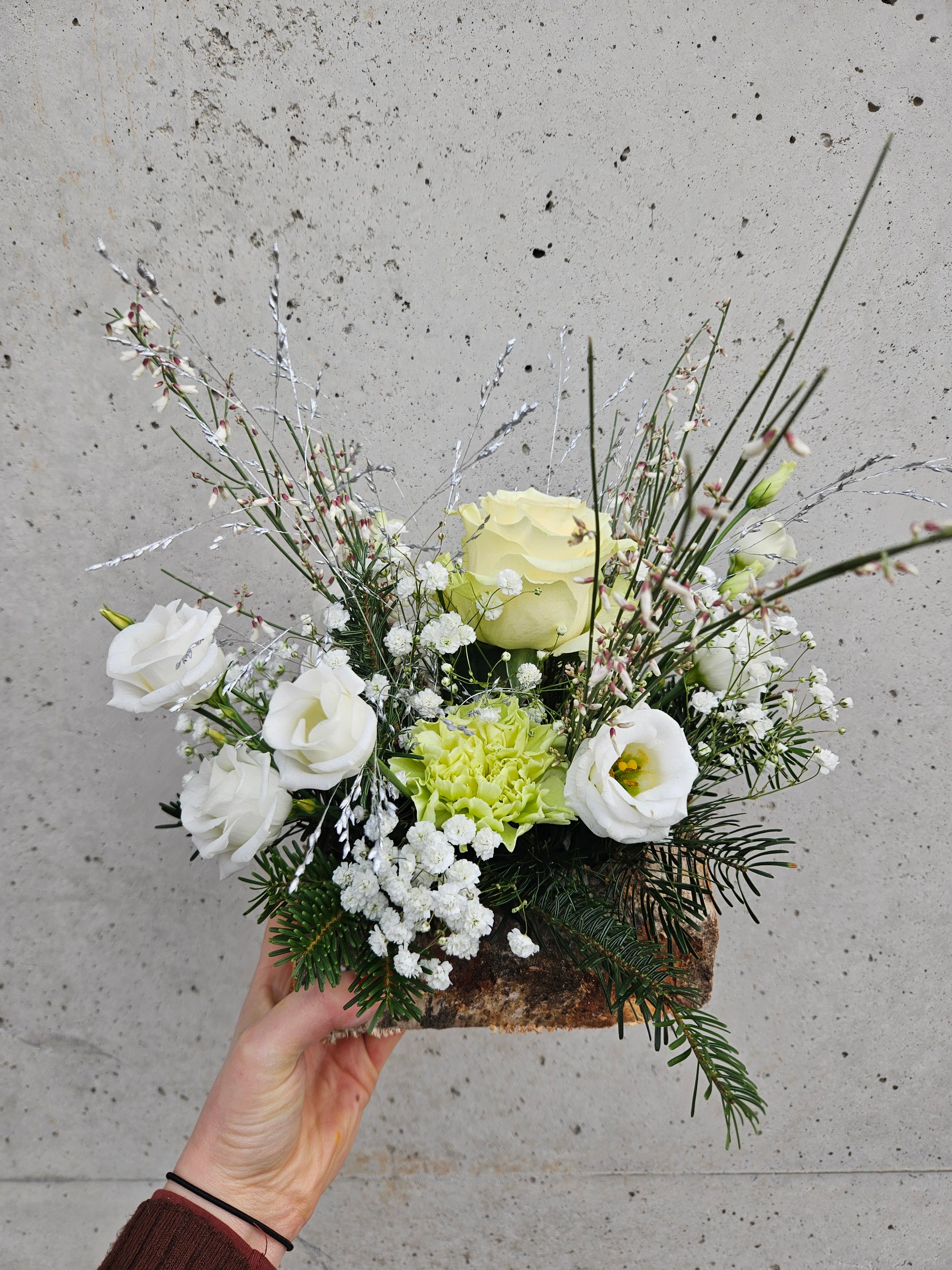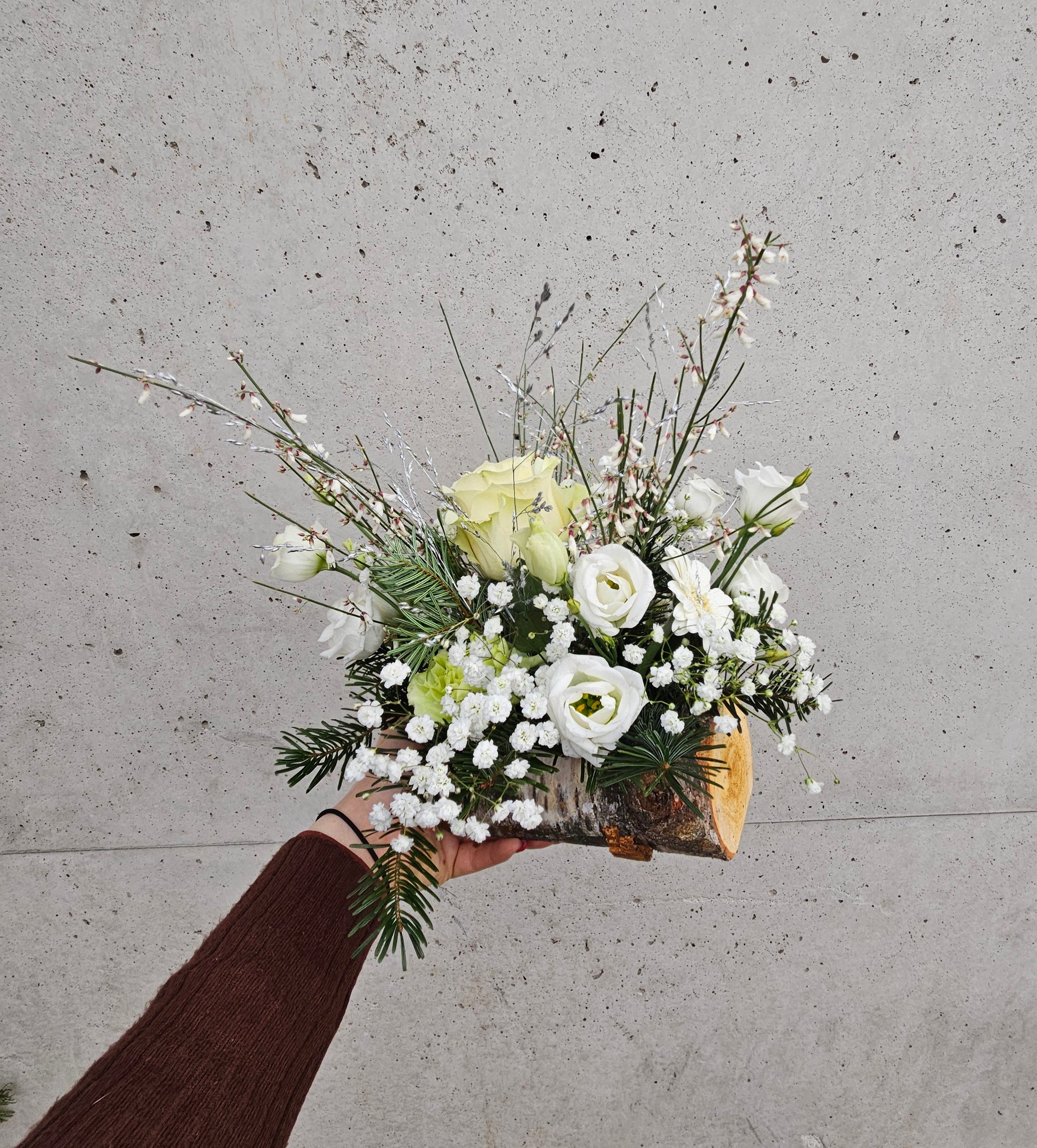 Composition de fleurs piquée dans une bûche en bois dans les tons de blanc composé de rose, lysianthus, germini, gypsophile, sapin et d'autres fleurs.