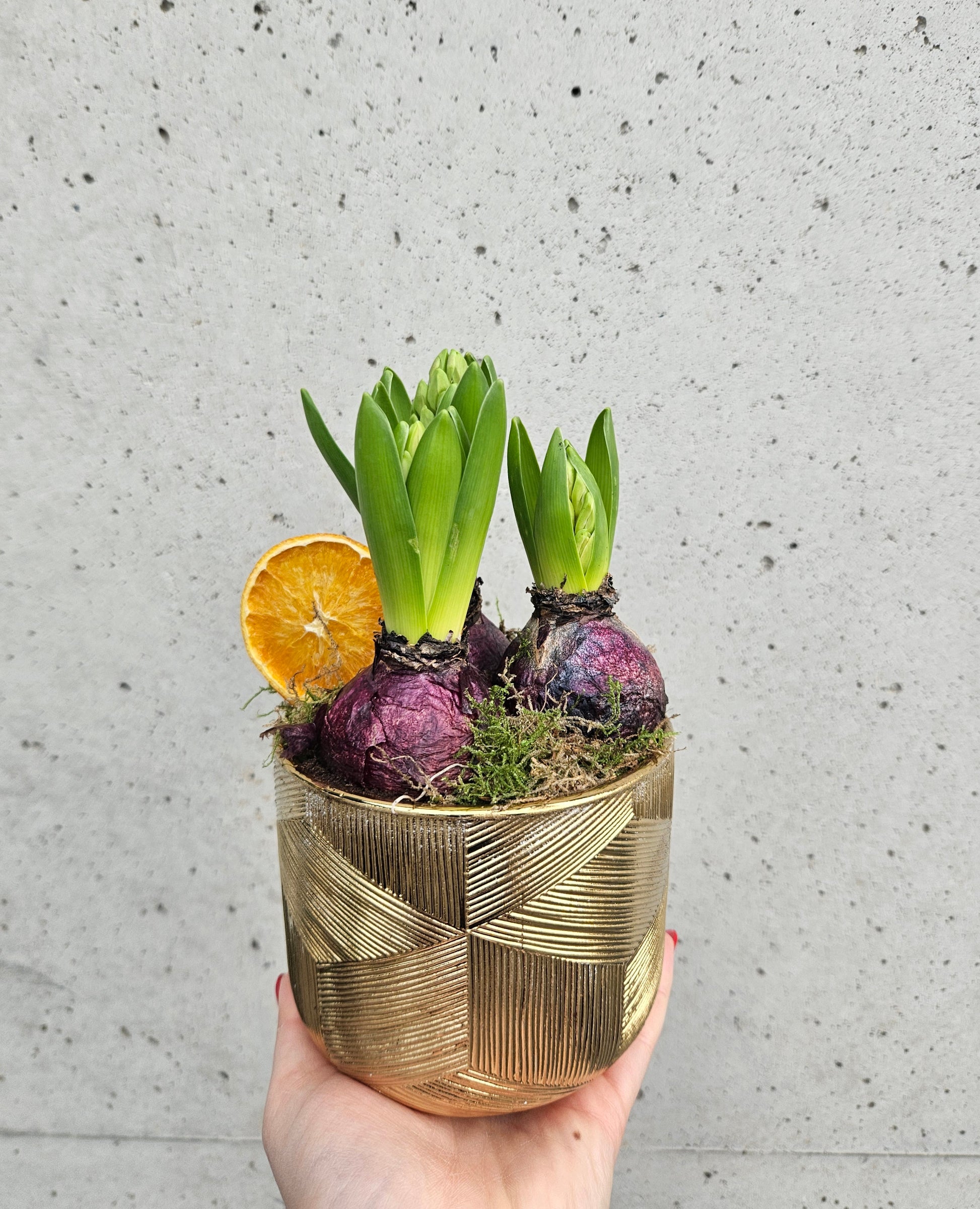 Les Jacinthes sont des bulbes qui fleurissent en intérieur ou en extérieur, très facile d'entretien, elle sont accompagnée d'un cache-pot. (contenant pouvant changer selon l'approvisionnement)